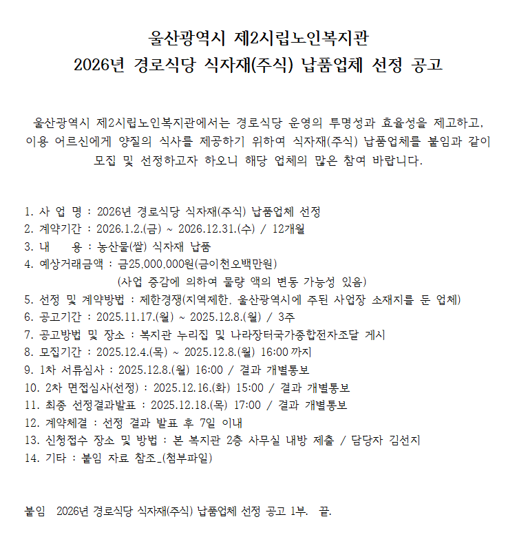 공지사항 2025.11.17 울산광역시 제2시립노인복지관 2026년 경로식당 식자재(주식) 납품업체 선정 공고 조회수 : 182 Download 공고문-울산광역시-제2시립노인복지관-2026년-경로식당-식자재-납품업체-선정-공고주식.hwpx