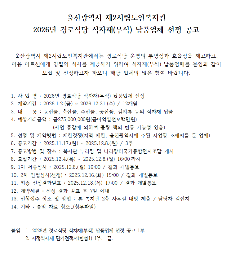 공지사항 2025.11.17 울산광역시 제2시립노인복지관 2026년 경로식당 식자재(부식) 납품업체 선정 공고 조회수 : 103 Download 공고문-울산광역시-제2시립노인복지관-2026년-경로식당-식자재-납품업체-선정-공고부식.hwpx 2026년-경로식당-식자재부식-납품업체_지정식자재-견적서별첨1.xlsx