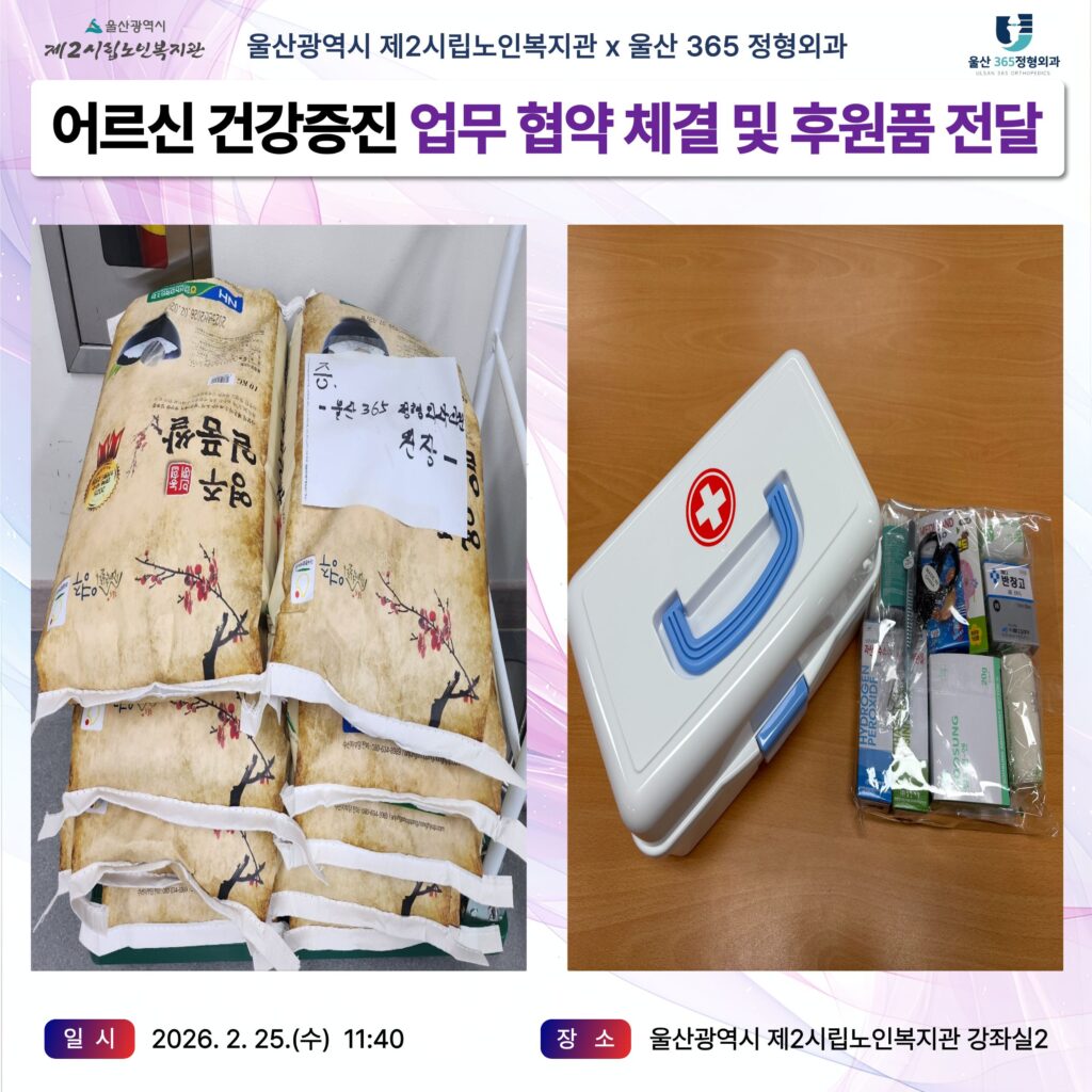 어르신들의 든든한 건강 주치의가 되어주신 울산365정형외과 관계자분들께 깊은 감사를 드립니다. 앞으로도 본 복지관은 지역 의료기관과 긴밀히 협력하여, 어르신들이 살기 좋은 행복한 울산을 만드는 데 앞장서겠습니다.