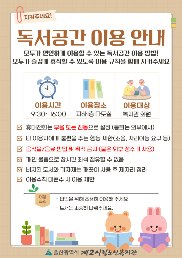 공지사항 2026.02.04 취미여가실 독서공간 운영안내 ※ 별도 예약 없이 입구 출석기기에 회원증 태그 후 바로 입장 가능합니다! 조용하고 편안한 사색의 장, “독서공간”에 회원님들의 많은 관심과 이용 부탁드립니다. 조회수 : 54
