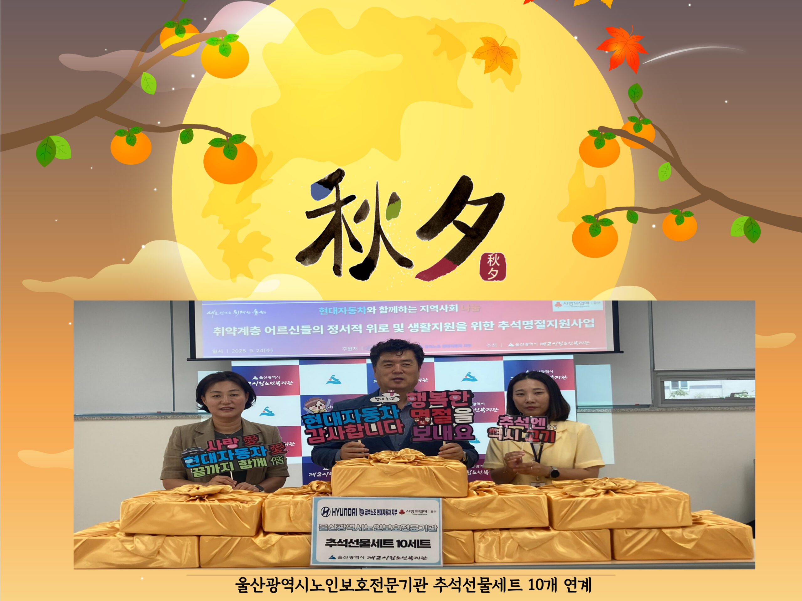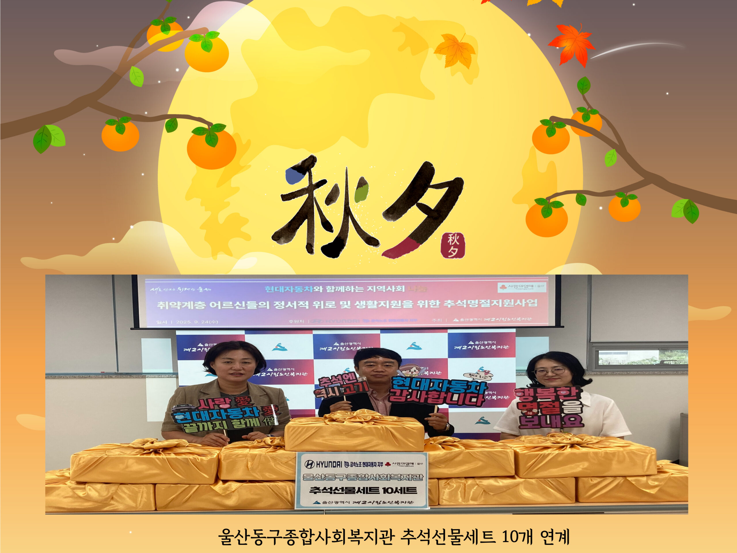 현대자동차에서 총 500만원 상당의 후원금을 지원해주셔서 추석명절선물세트를 울산 지역 내 취약계층에게 전달하였습니다.
