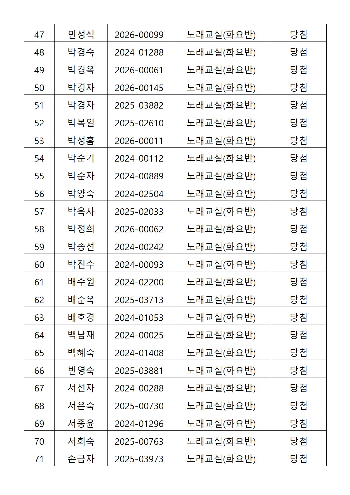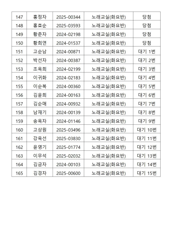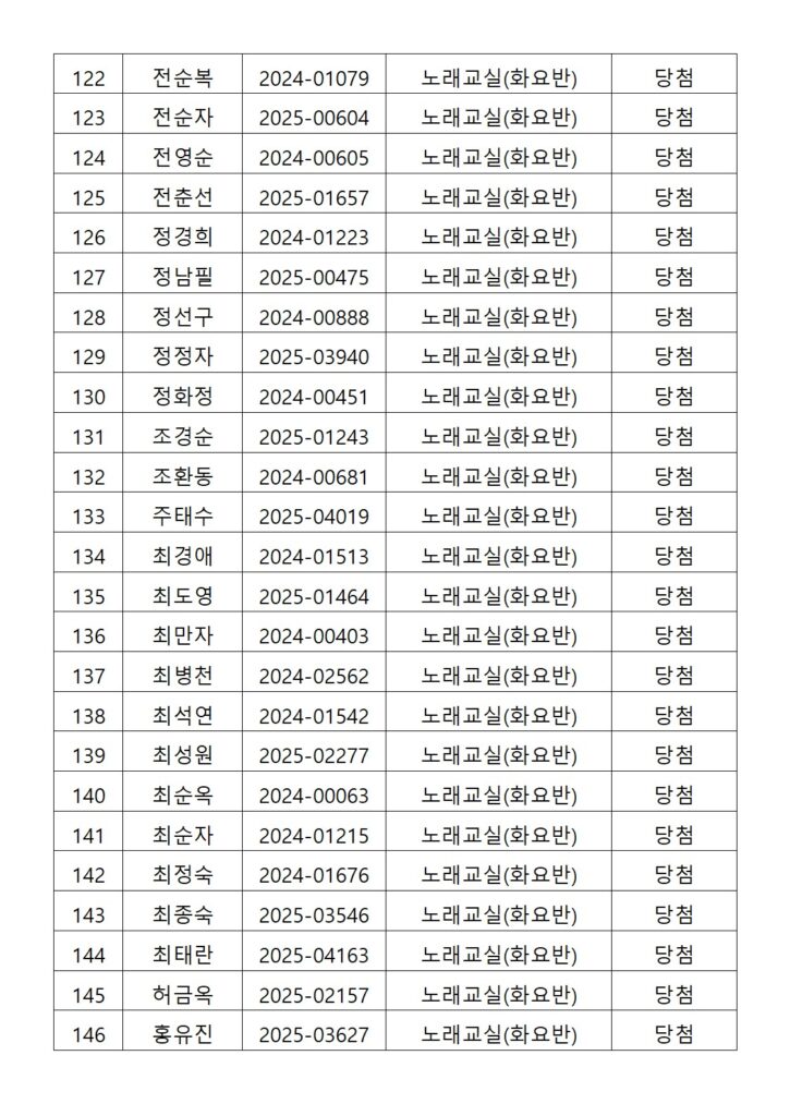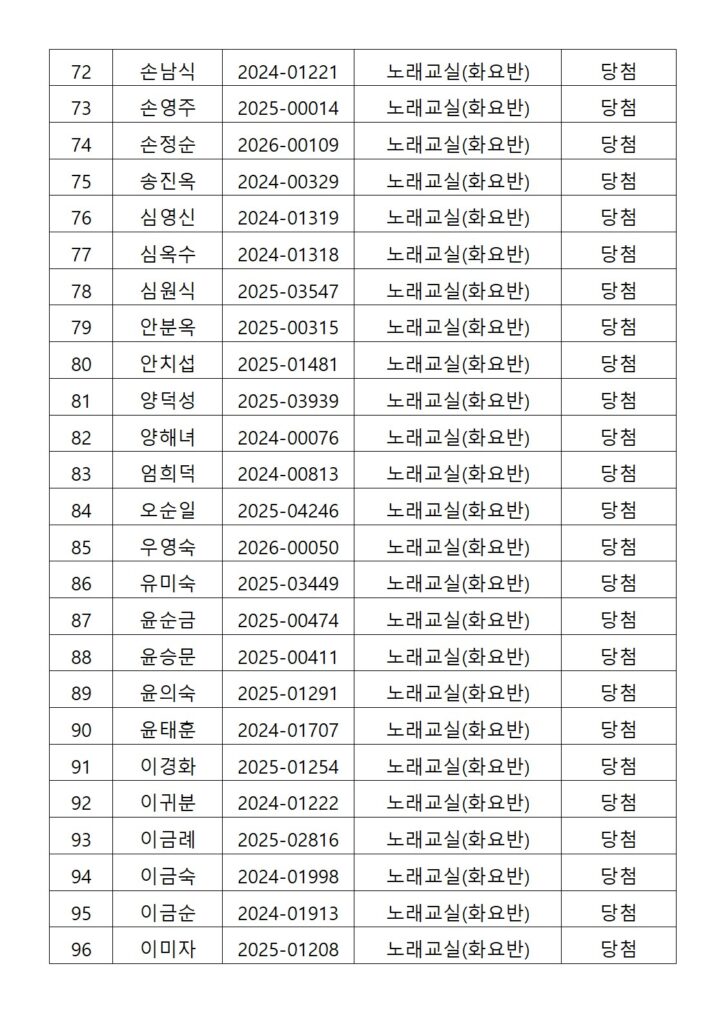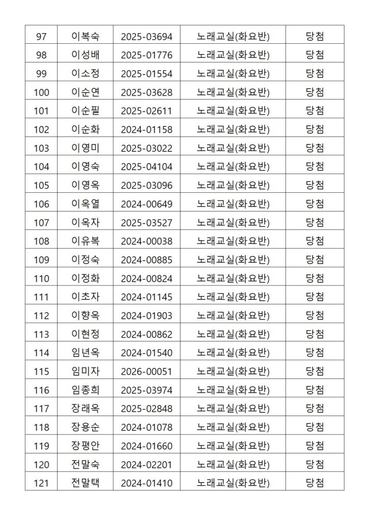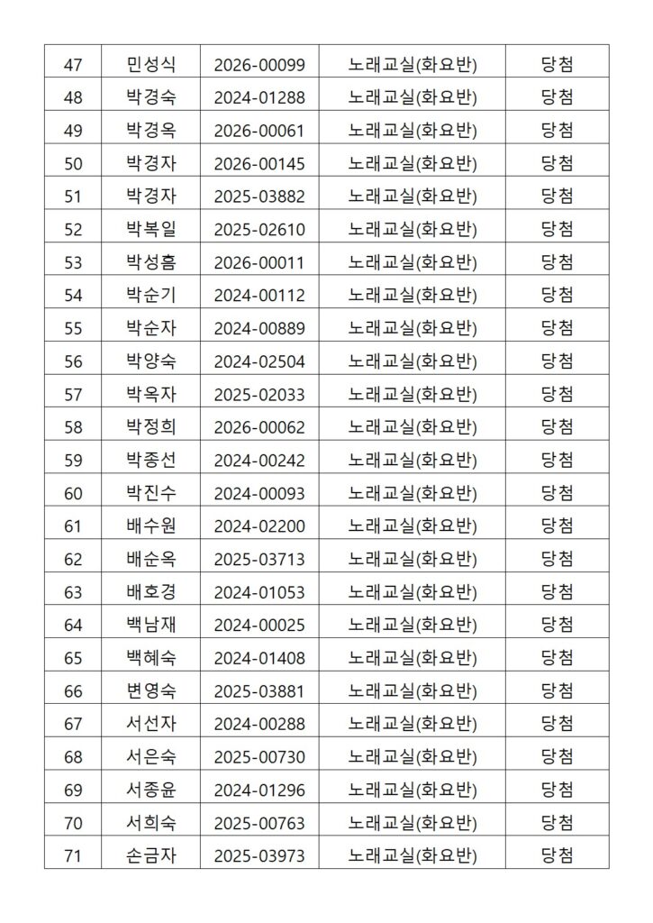 [2026년도 상반기 평생교육프로그램 노래교실(화요반) 추첨결과 안내]