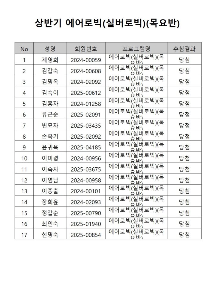 [2026년도 상반기 평생교육프로그램 에어로빅(실버로빅)(목요반) 추첨결과 안내]