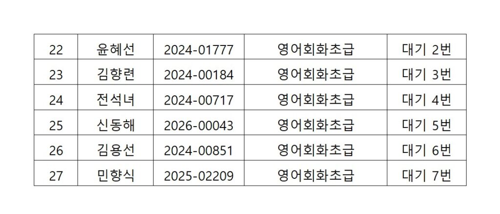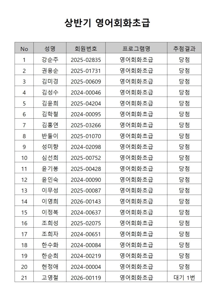 [2026년도 상반기 평생교육프로그램 영어회화초급 추첨결과 안내]