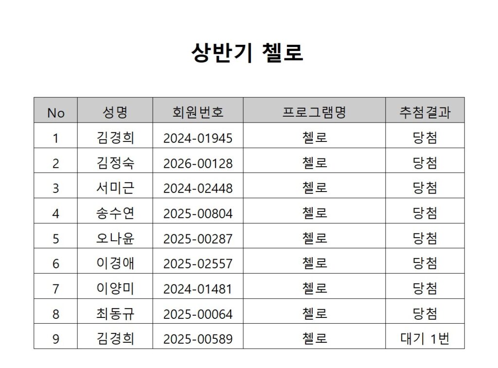 [2026년도 상반기 평생교육프로그램 첼로 추첨결과 안내]