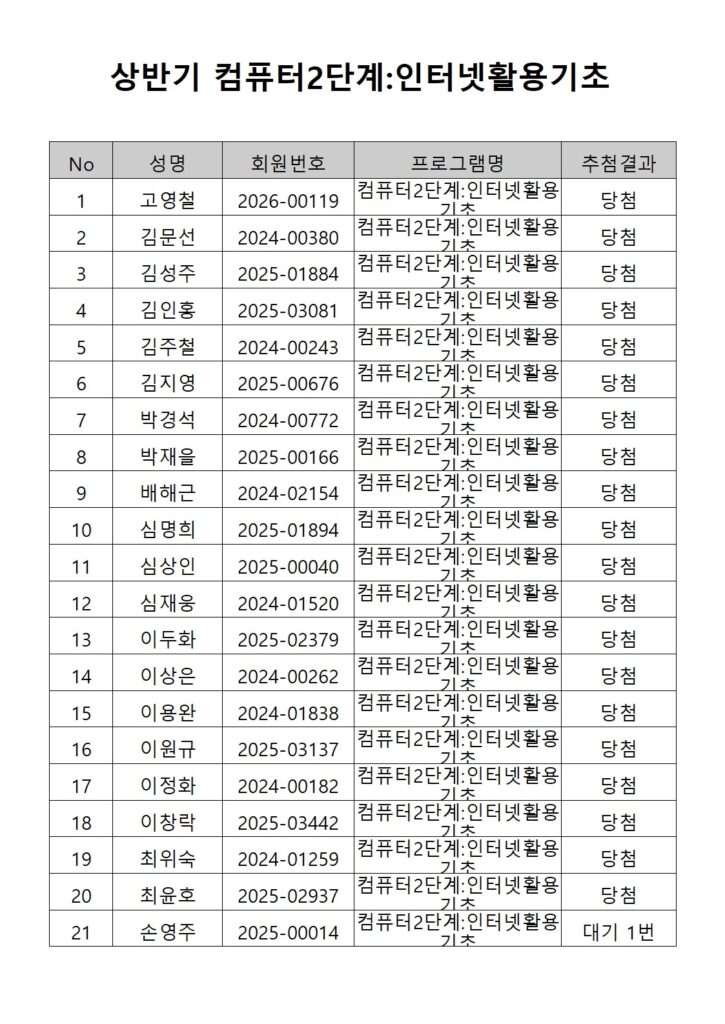 [2026년도 상반기 평생교육프로그램 컴퓨터2단계(인터넷활용기초) 추첨결과 안내]