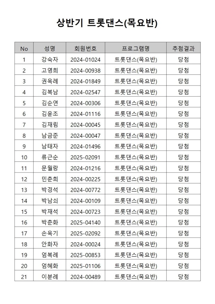 [2026년도 상반기 평생교육프로그램 트롯댄스(목요반) 추첨결과 안내]