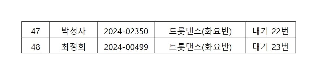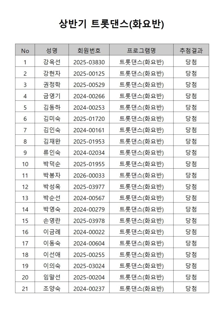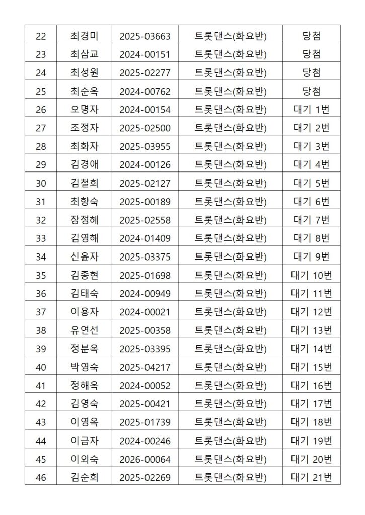 [2026년도 상반기 평생교육프로그램 트롯댄스(화요반) 추첨결과 안내]