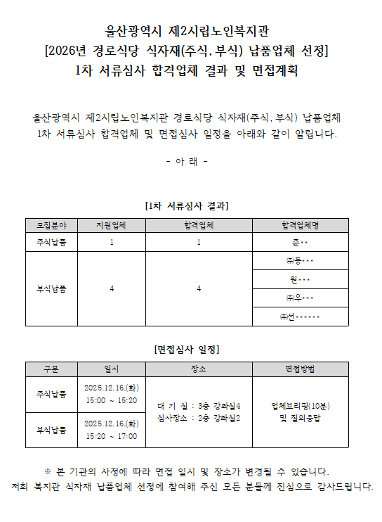 2026년 경로식당 식자재(주식, 부식) 납품업체 선정 1차 서류심사 결과 공고