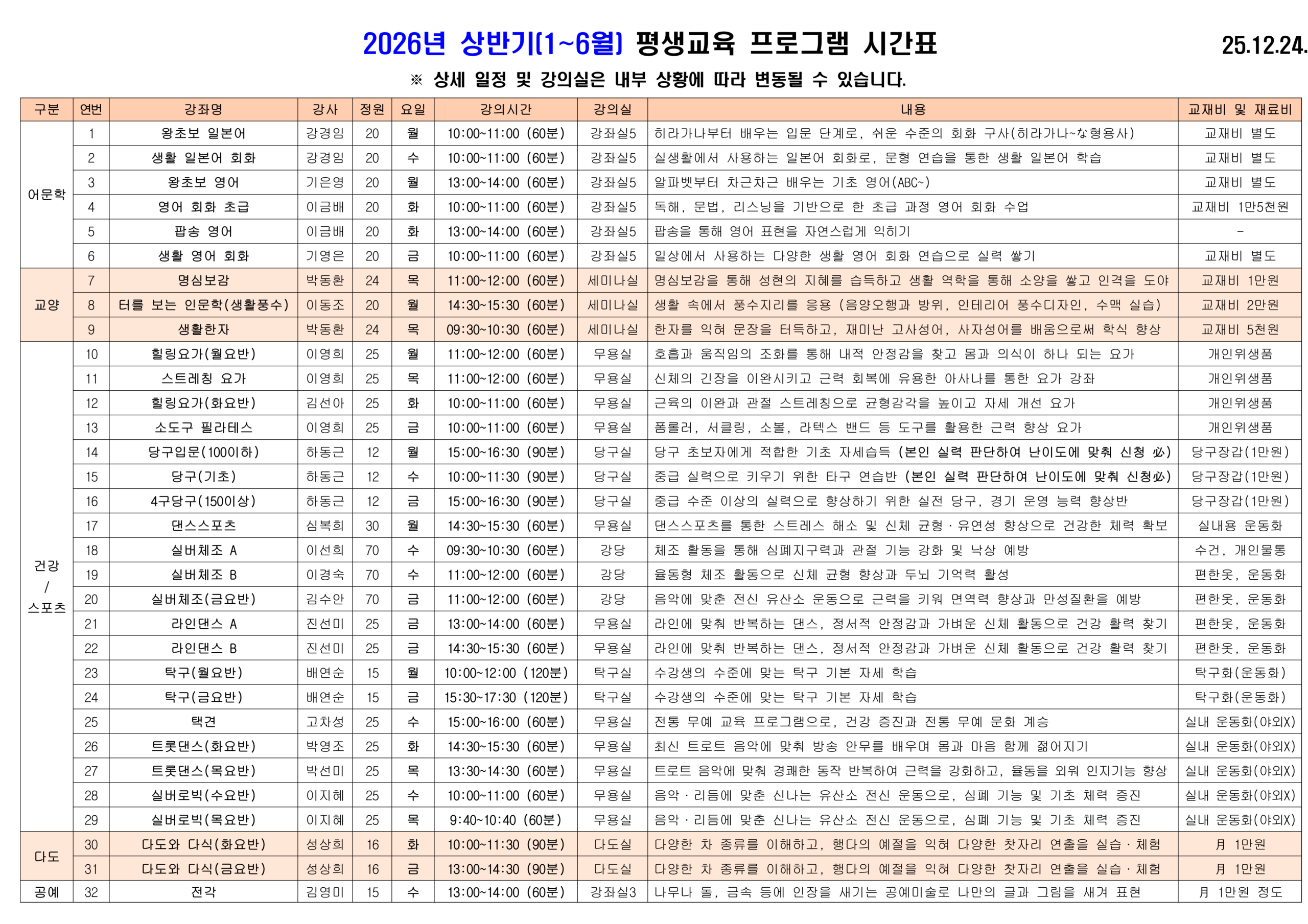 2026년 상반기 평생교육 프로그램 시간표 및 수강신청 안내