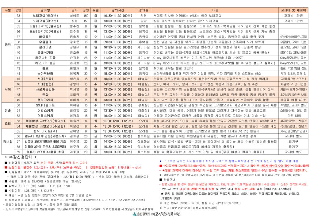 ※ 중복과목 신청불가: 시간중복, 동일분야, 수준별수업 (예:라인댄스1,라인댄스2 / 당구입문,당구기초)